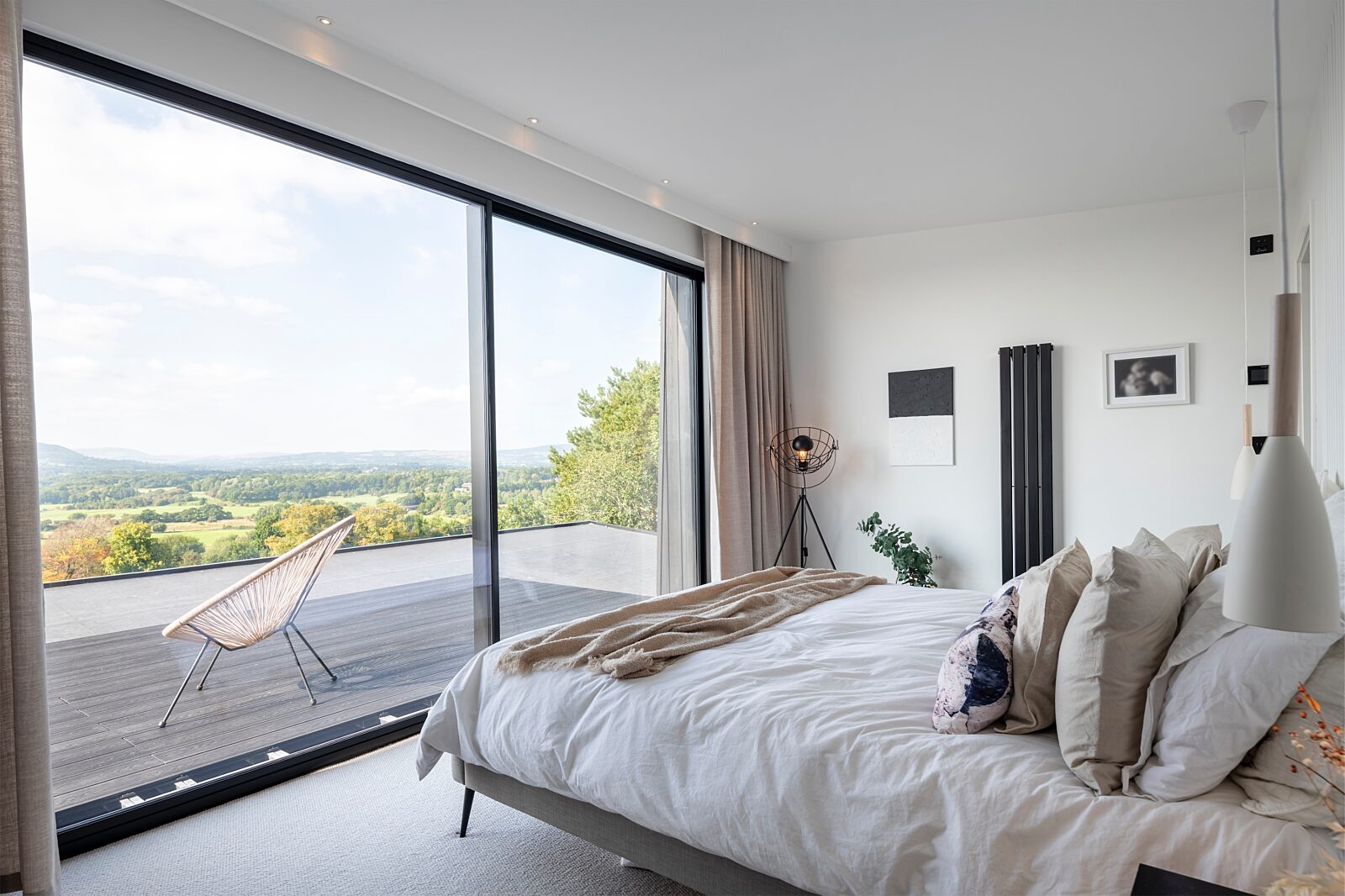 The SIPs upper ground floor comprises a kitchen which was designed by Joanna and manufactured and fitted by a local start up company, dining room and double height sitting room, left open to the eaves with cantilevered balcony that makes the most of the breath taking views. There is also a playroom that leads directly into the terraced garden with a SIPs overhang that provides shade for the children when playing outside in the sunshine. There is a large boot room, utility room, downstairs shower and cloak room, together with an additional bedroom and study/guest bedroom.
