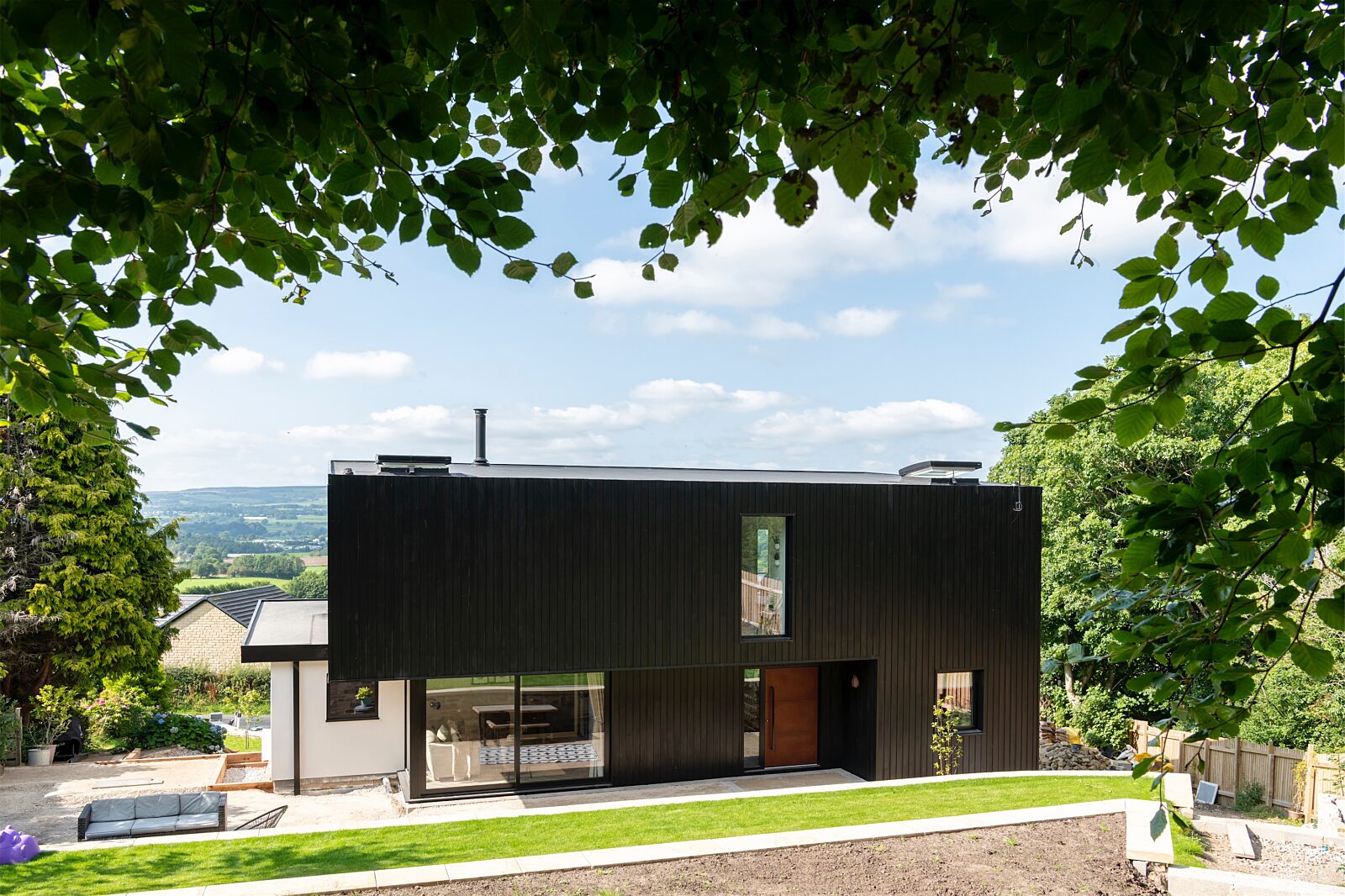 With 6 bedrooms 4 bathrooms, the upper ground and first floor are constructed from 142mm Kingspan TEK Building System, built on a concrete lower ground basement structure which is sunk into the hillside. The stylish home is wrapped in Corten steel, standing seam aluminium and black burnt larch cladding, complemented by off-white Wetherby render.