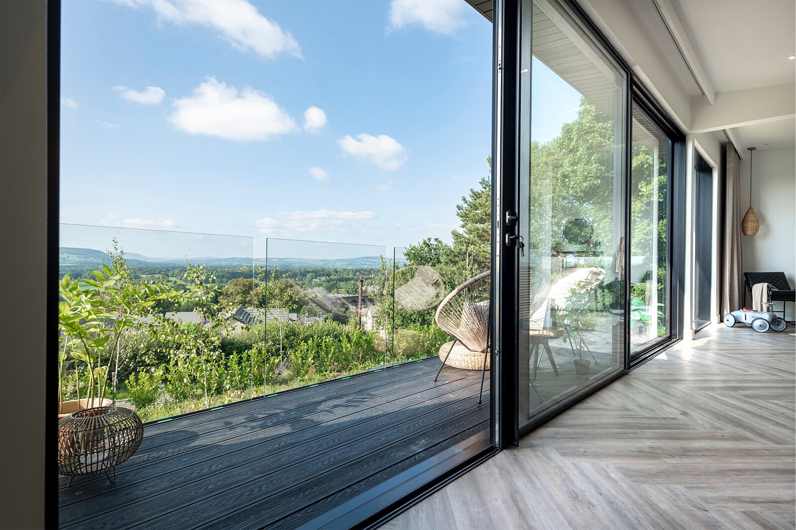 The first floor has three large bedrooms and main bathroom which has roof space left open to the eaves with Velux windows. The high eaves have allowed for a raised den and swing in the children’s room. The master en suite bedroom has a large dressing room and an impressive roof terrace with composite decking, that creates an oasis of calm for Sam and Joanna.