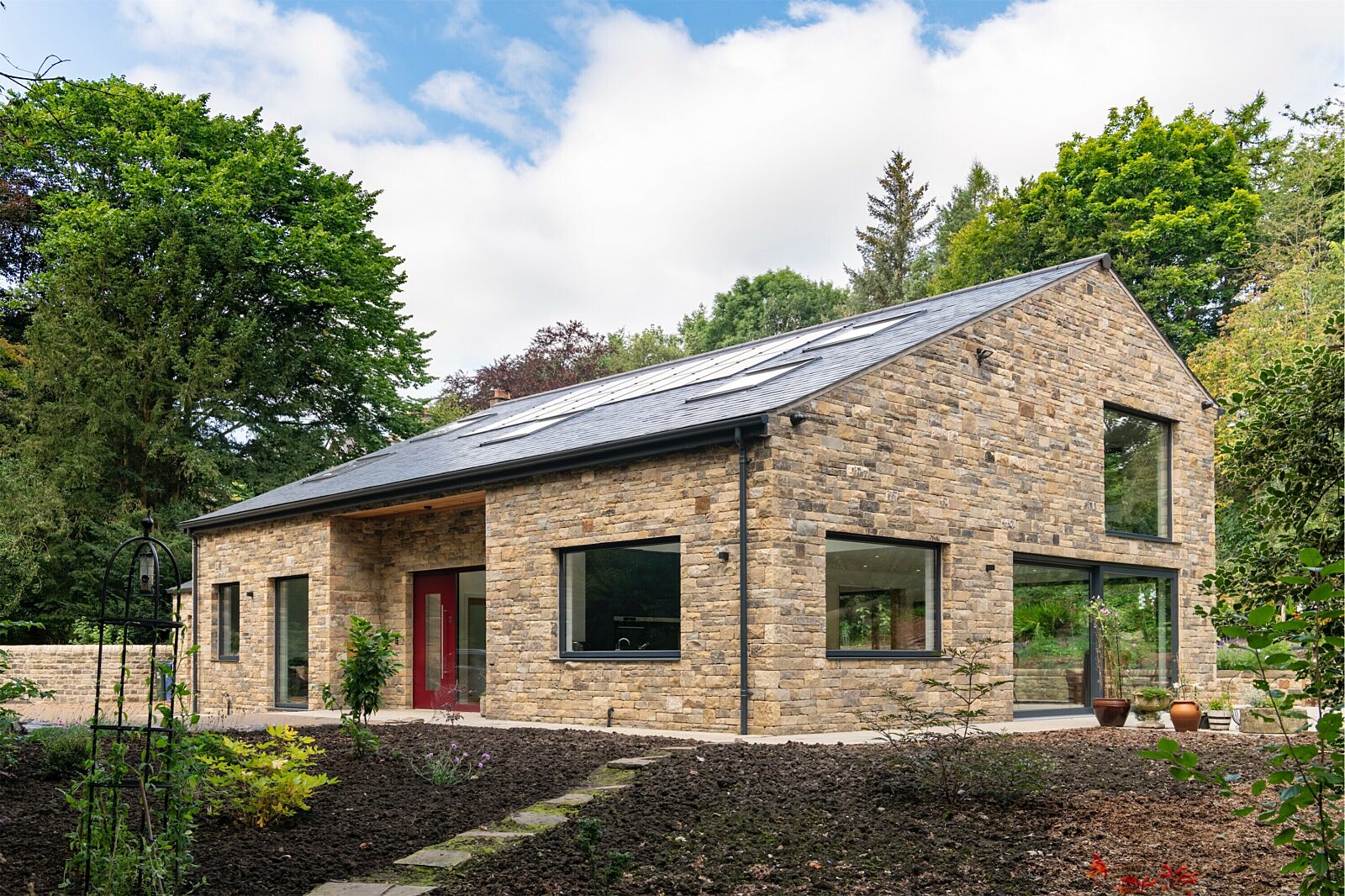 The 3 bed detached SIPs home, which achieved an impressive 1.5m3/h.m2 in the airtightness test, is constructed from 142mm Kingspan TEK Building System. It is clad with close jointed traditional stone with a slate roof and has solar panels incorporated into the SIPs roof, an MVHR system, underfloor heating and has bespoke triple glazed Weru windows.