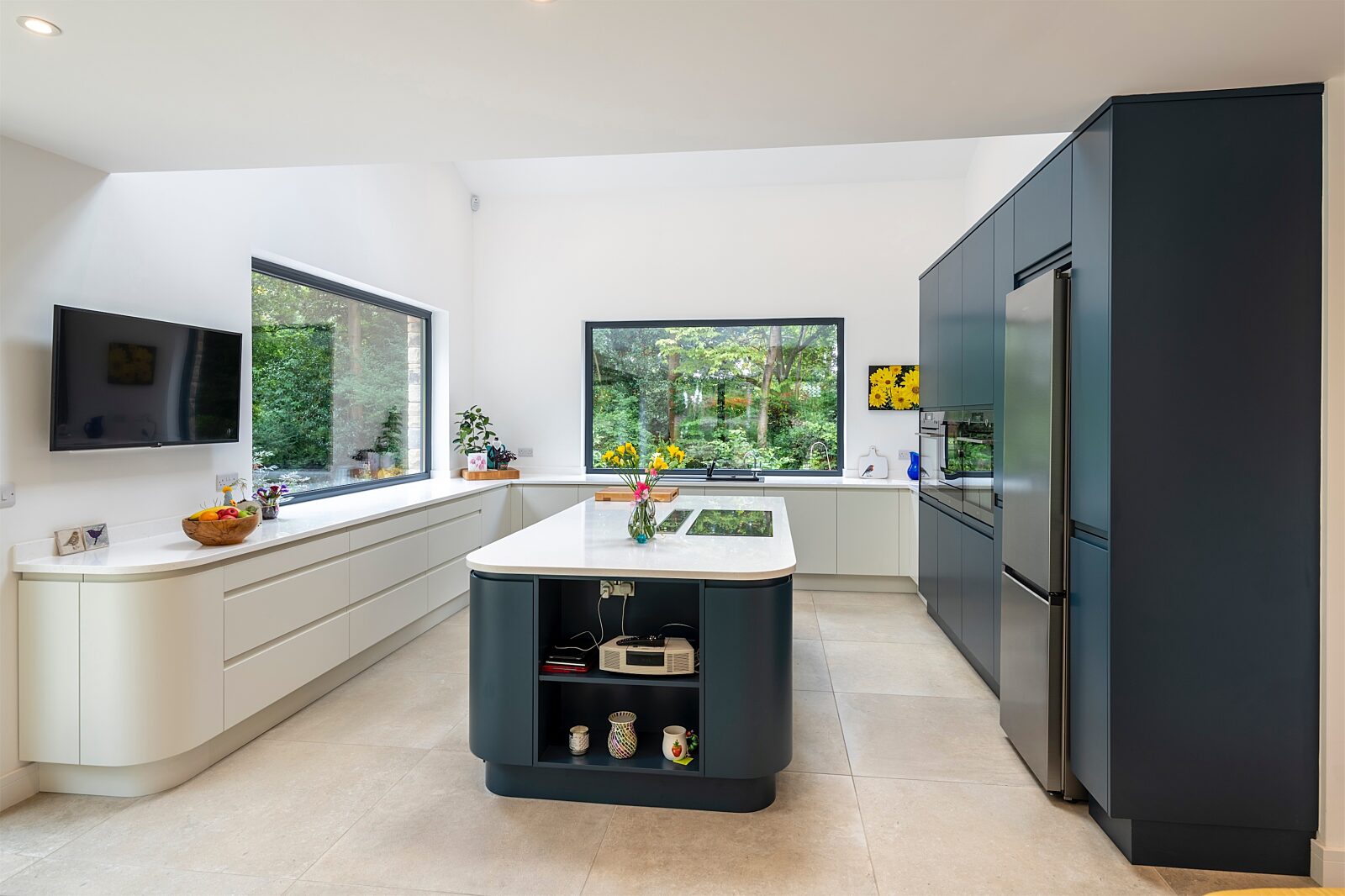 To enhance the kitchen views and give clean lines, the kitchen windows were carefully set to sit flush with the Corian work surfaces; this was achieved by diligent discussions and good working relationships between SIPS@Clays, Weru, kitchen designer and contractor Roger Tiffany Ltd. These large picture windows and additional ceiling height with Velux combine to give good light and a lovely working kitchen.