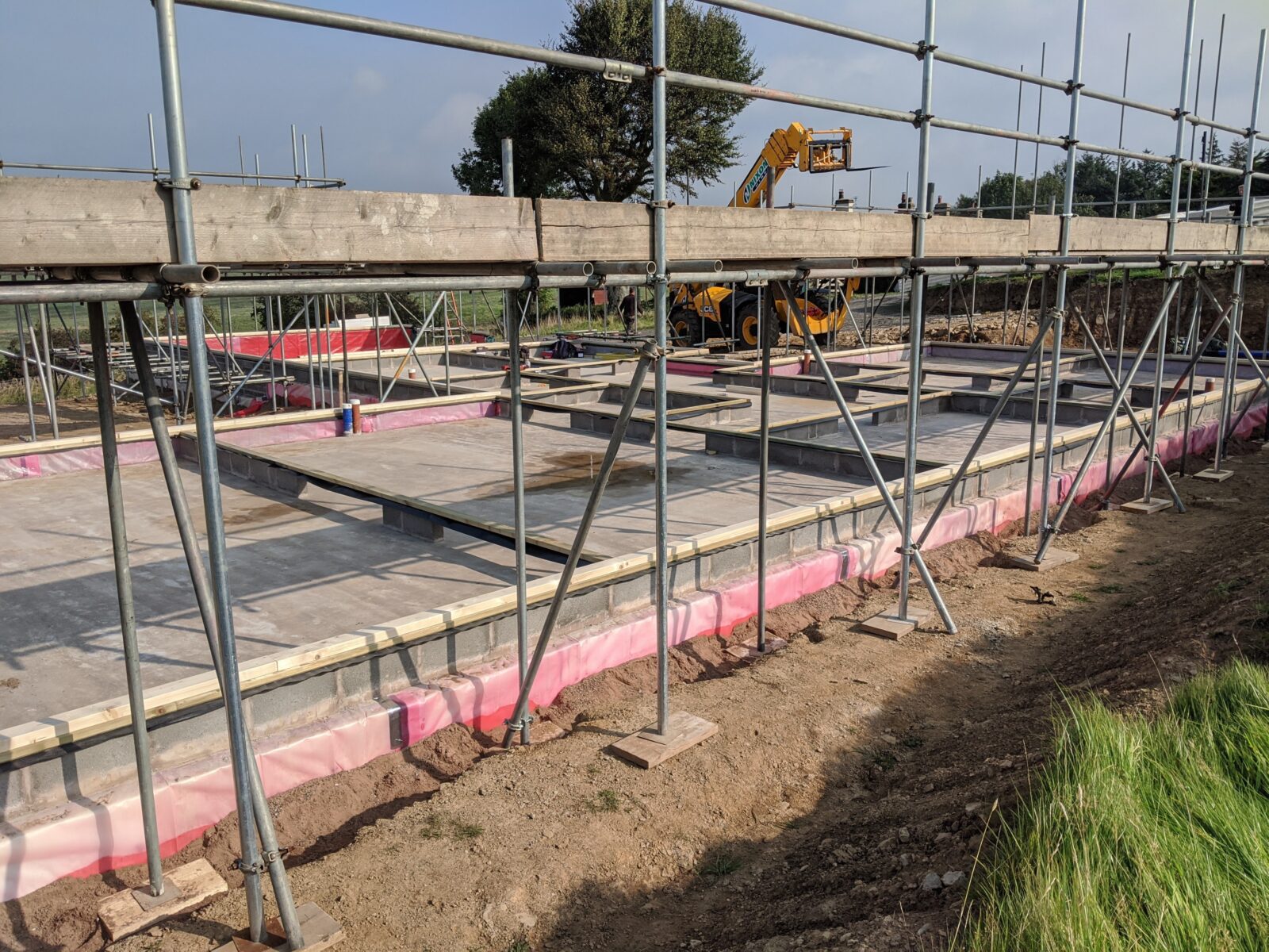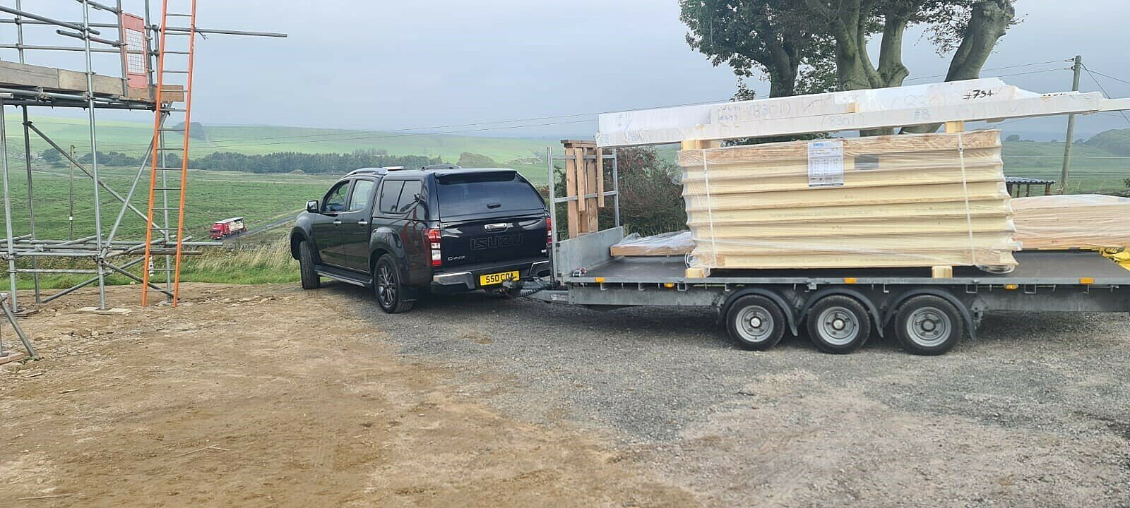 With the plot only accessible via one single track road with a difficult 90° turn going up the hill, the large articulated lorry deliveries which carried the SIPs panels had to be offloaded at the bottom of the track and then taken by flat trailer, towed by a pickup truck, onto the site. This would not have been possible with traditional methods of construction.