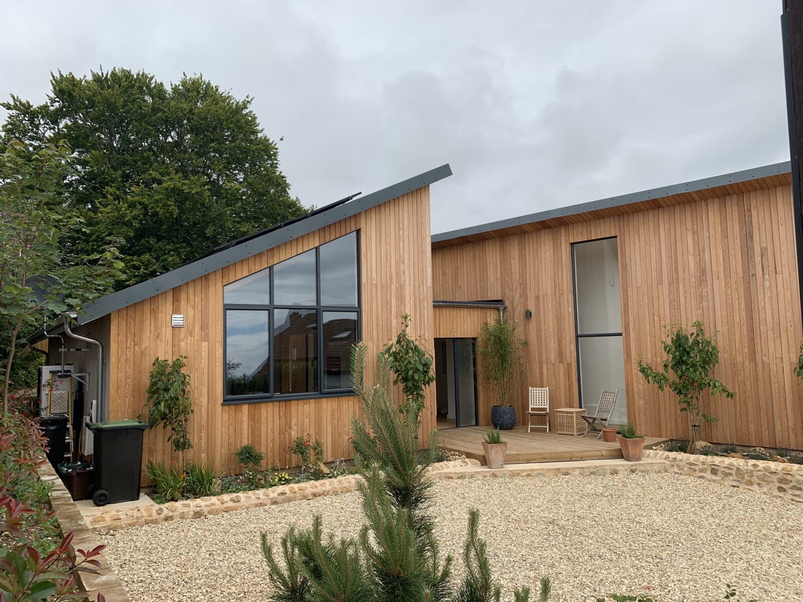 The SIPs structure incorporates two main rectangular block forms with mono pitch roof and a flat roof section which match the perimeter of the plot. This gives maximum space, and yet ease of build.