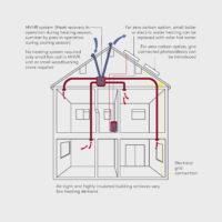 This is easily overcome by installing an MVHR system. In simple terms an MVHR unit extracts stale air, condensation and pollutants from each room and introduces a fresh, filtered air supply. During the extraction process, the MVHR heat exchange unit removes heat from the outgoing stream (mostly taken from kitchens and bathrooms) and through a network of ducting and heat exchange unit, recycles it by channelling it back into the incoming airflow to retain a constant air temperature and a healthy supply of fresh air throughout the house.